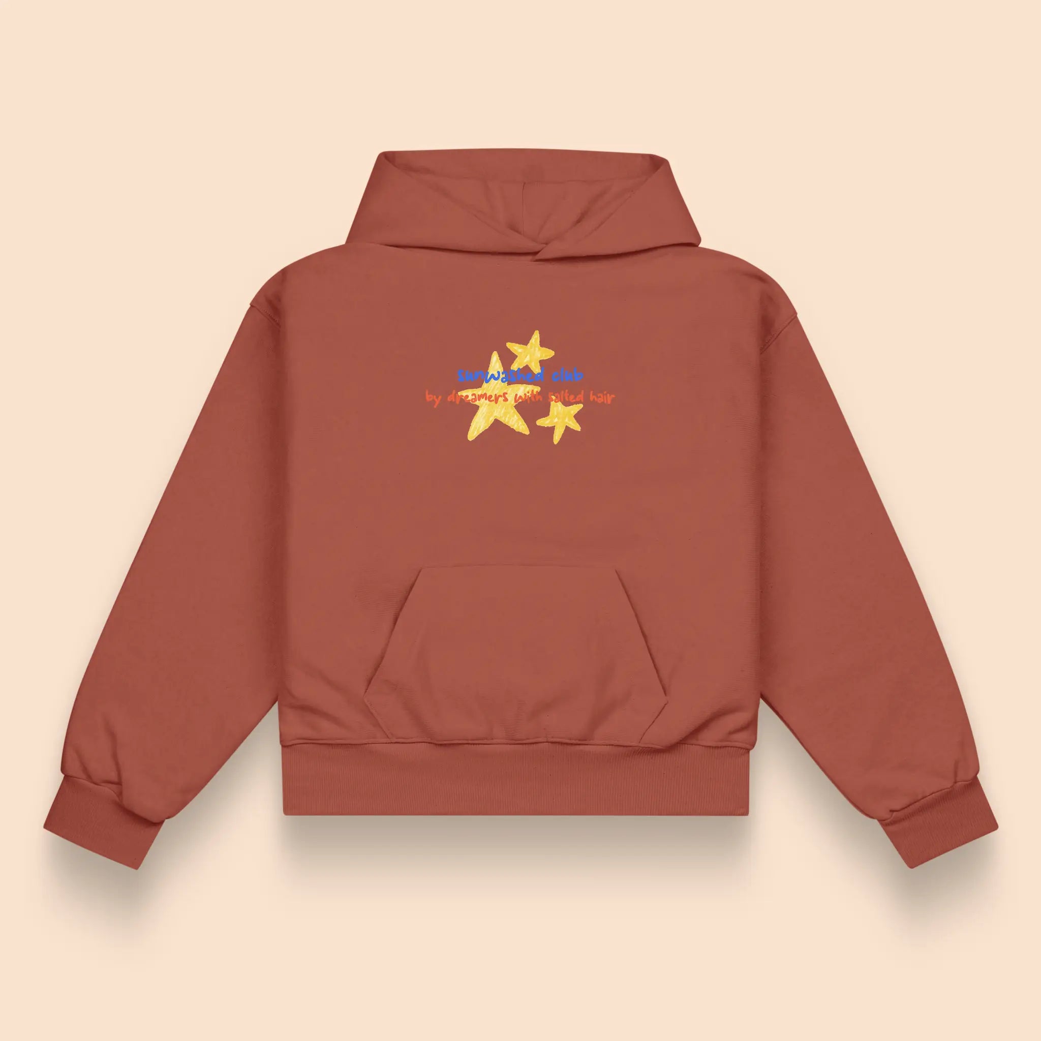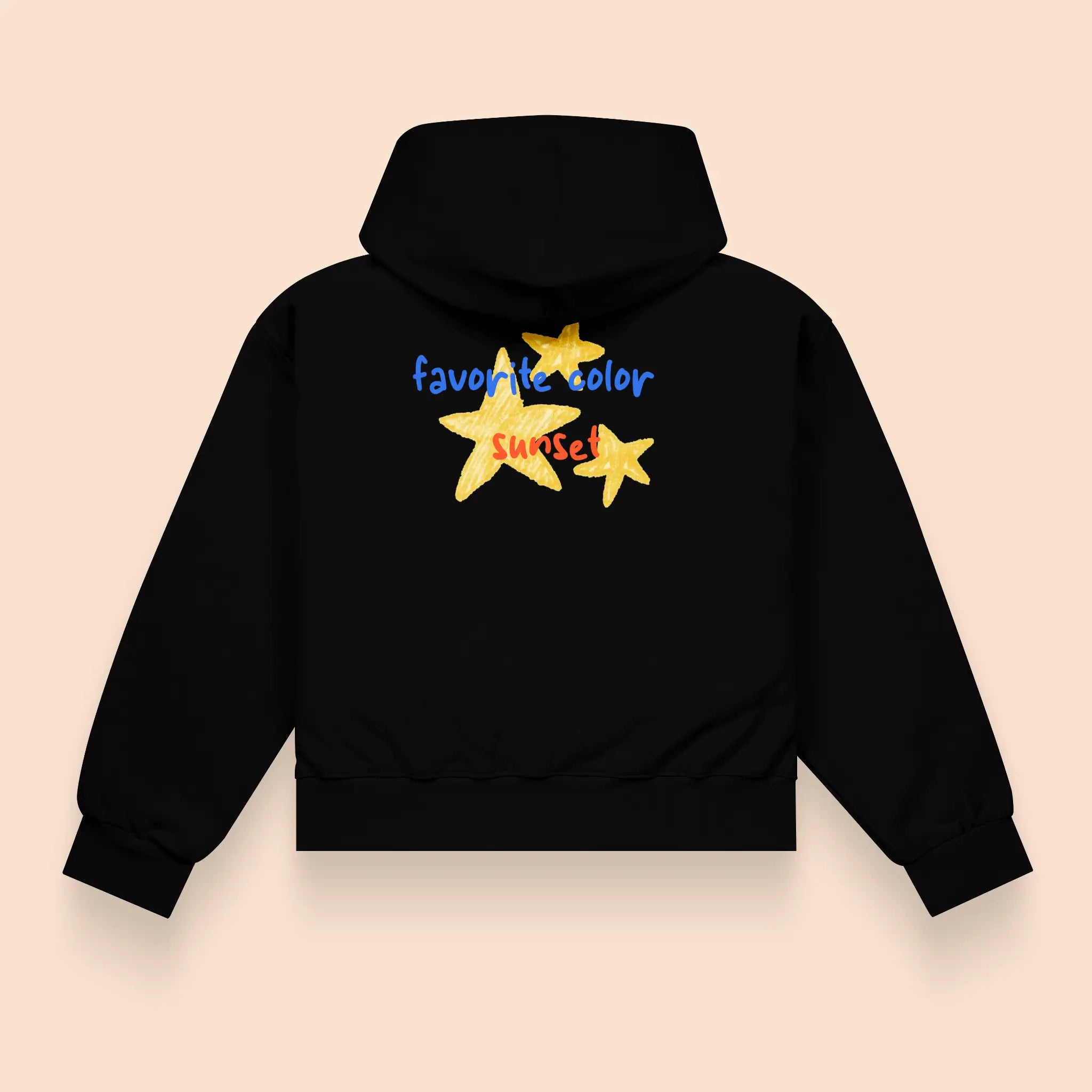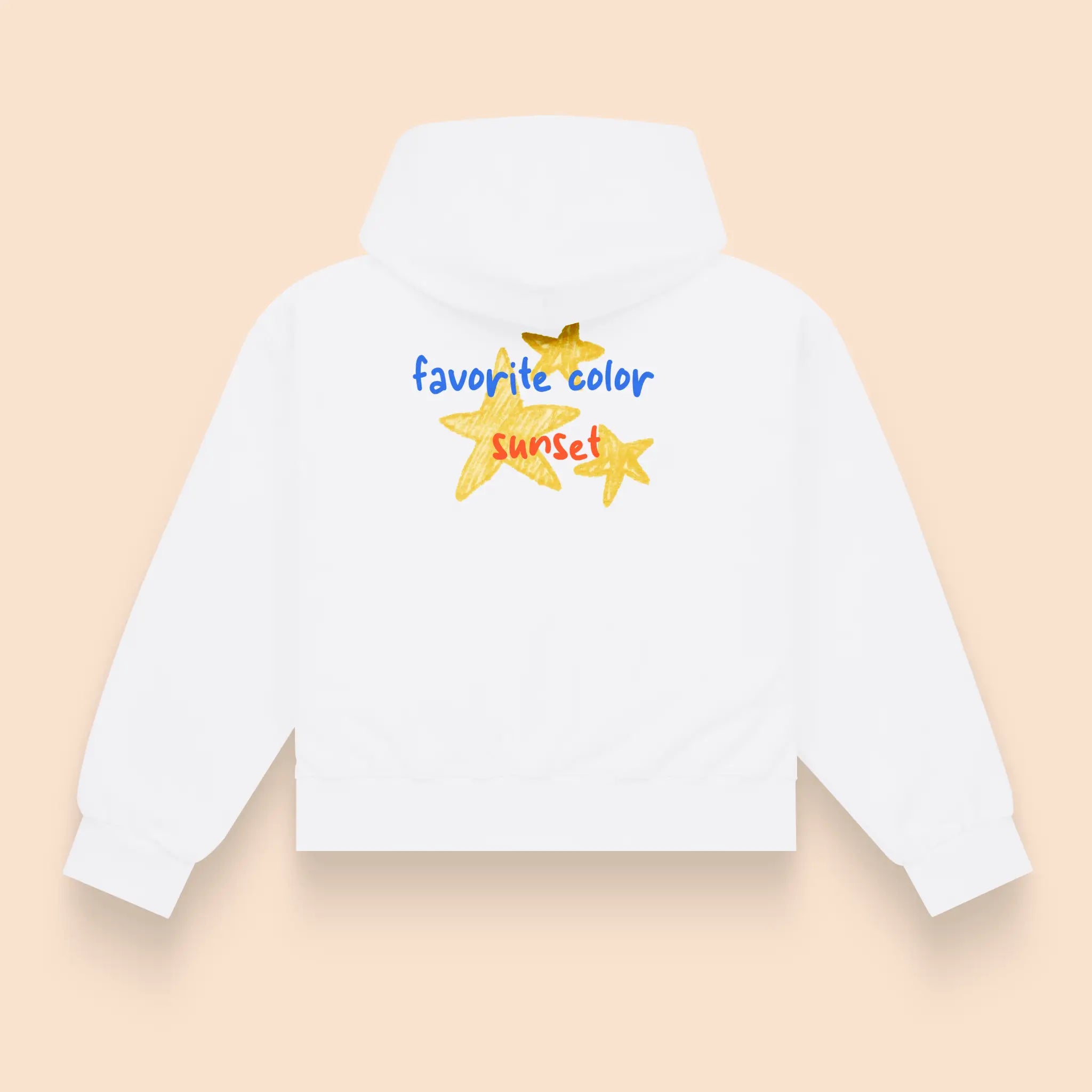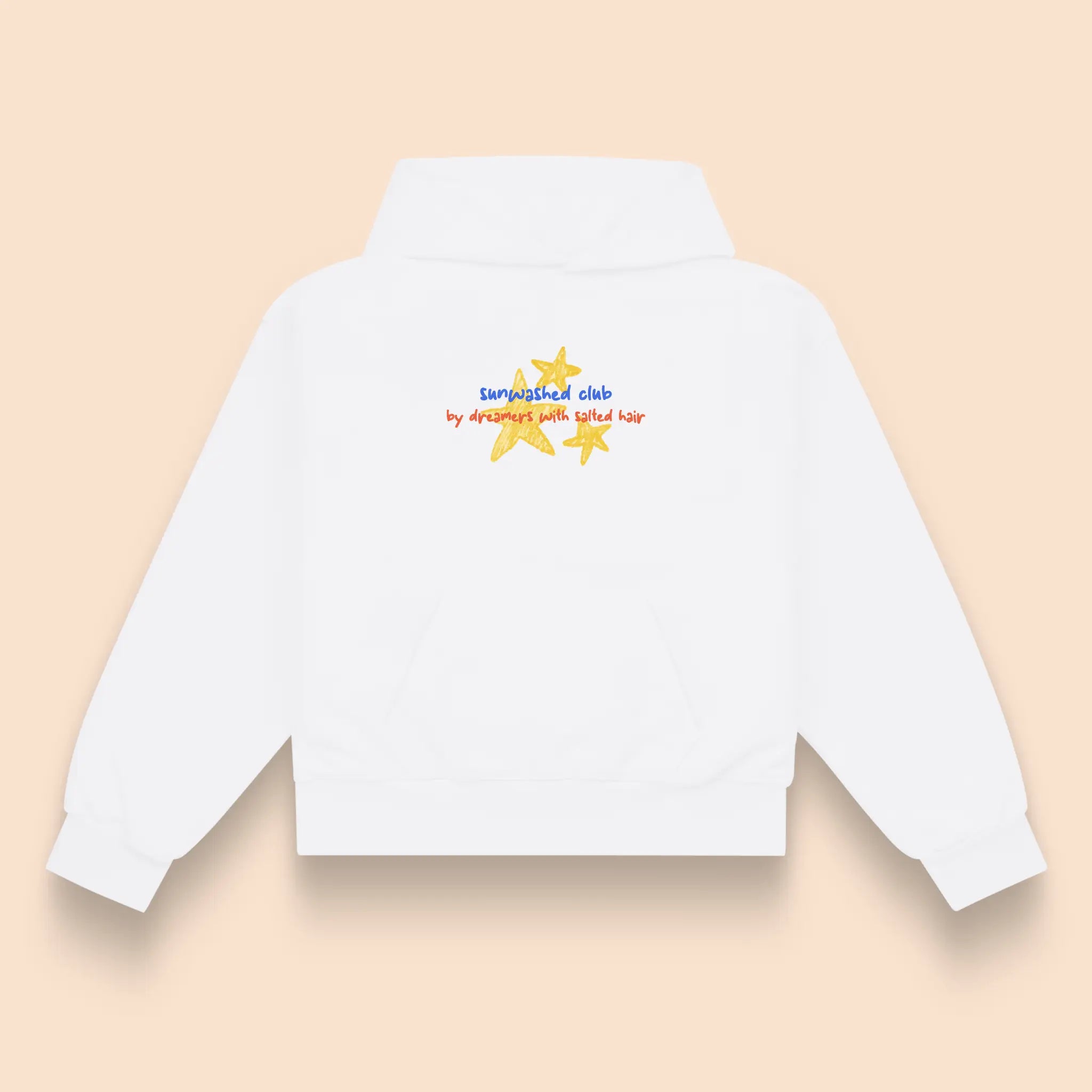 Un hommage aux couchers de soleil qui réchauffent nos plus beaux souvenirs. Ce hoodie capture la poésie des instants suspendus avec un design éclatant : des étoiles de mer dorées accompagnées de l’inscription “sunwashed club – by dreamers with salted hair” à l’avant, et la déclaration “favorite color : sunset” dans le dos.