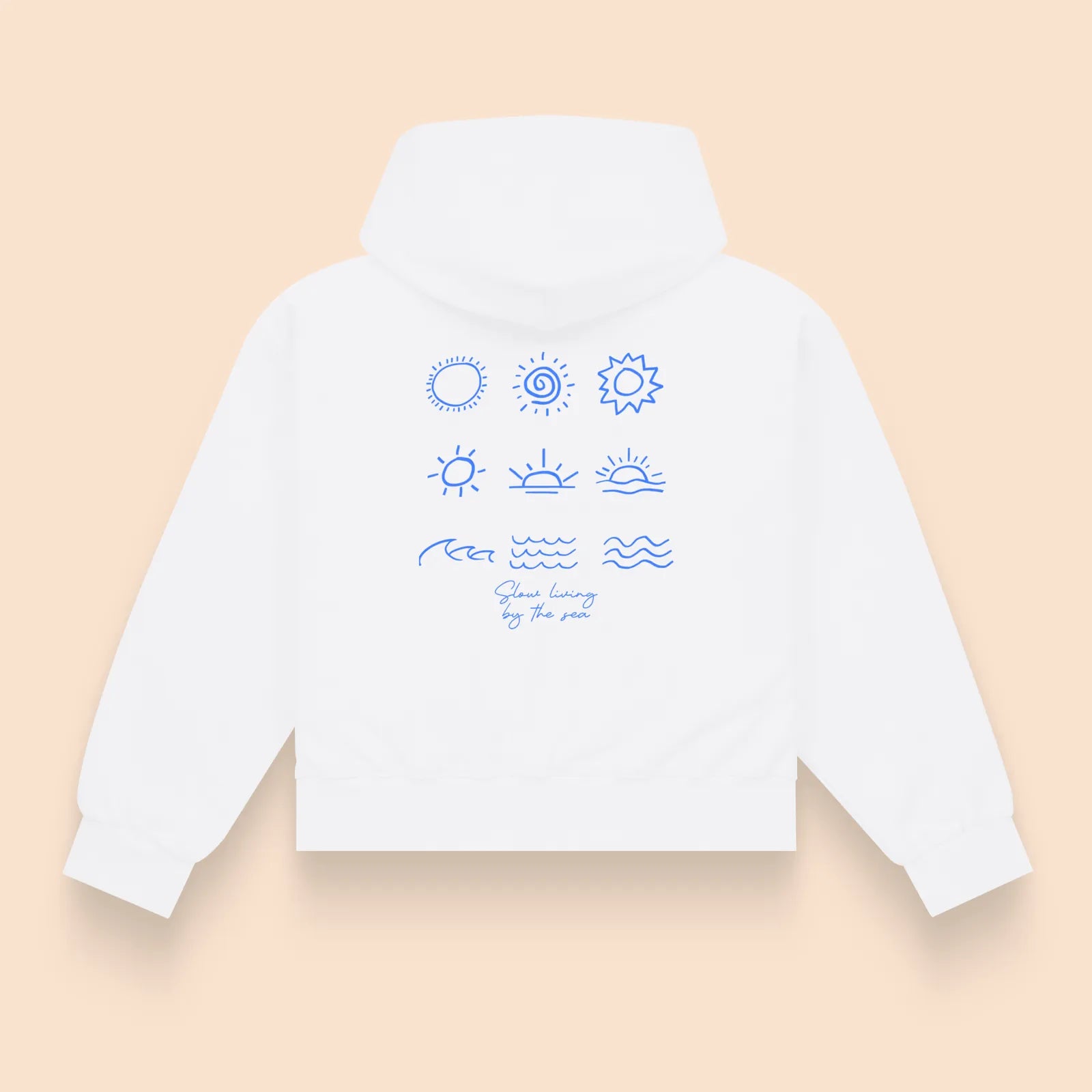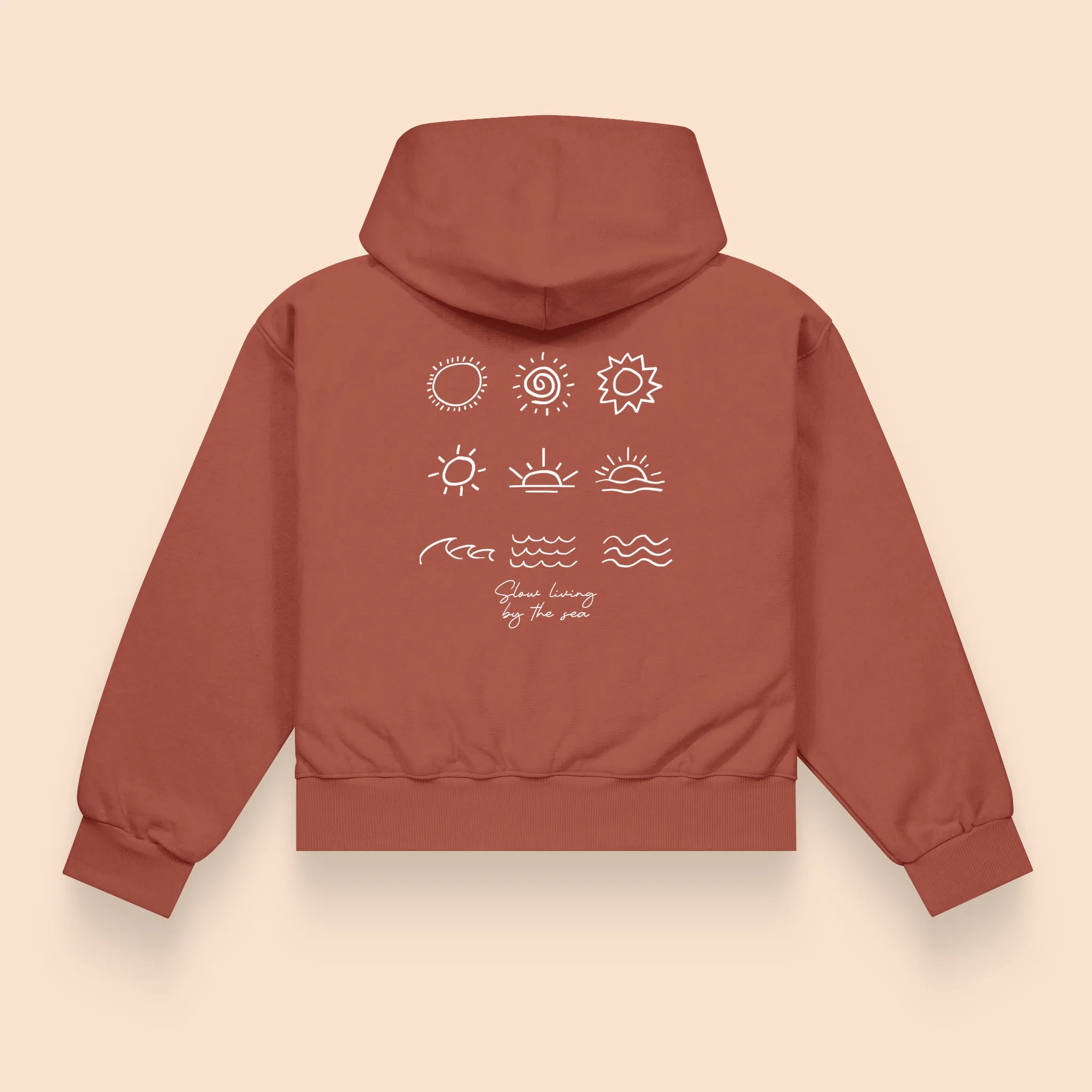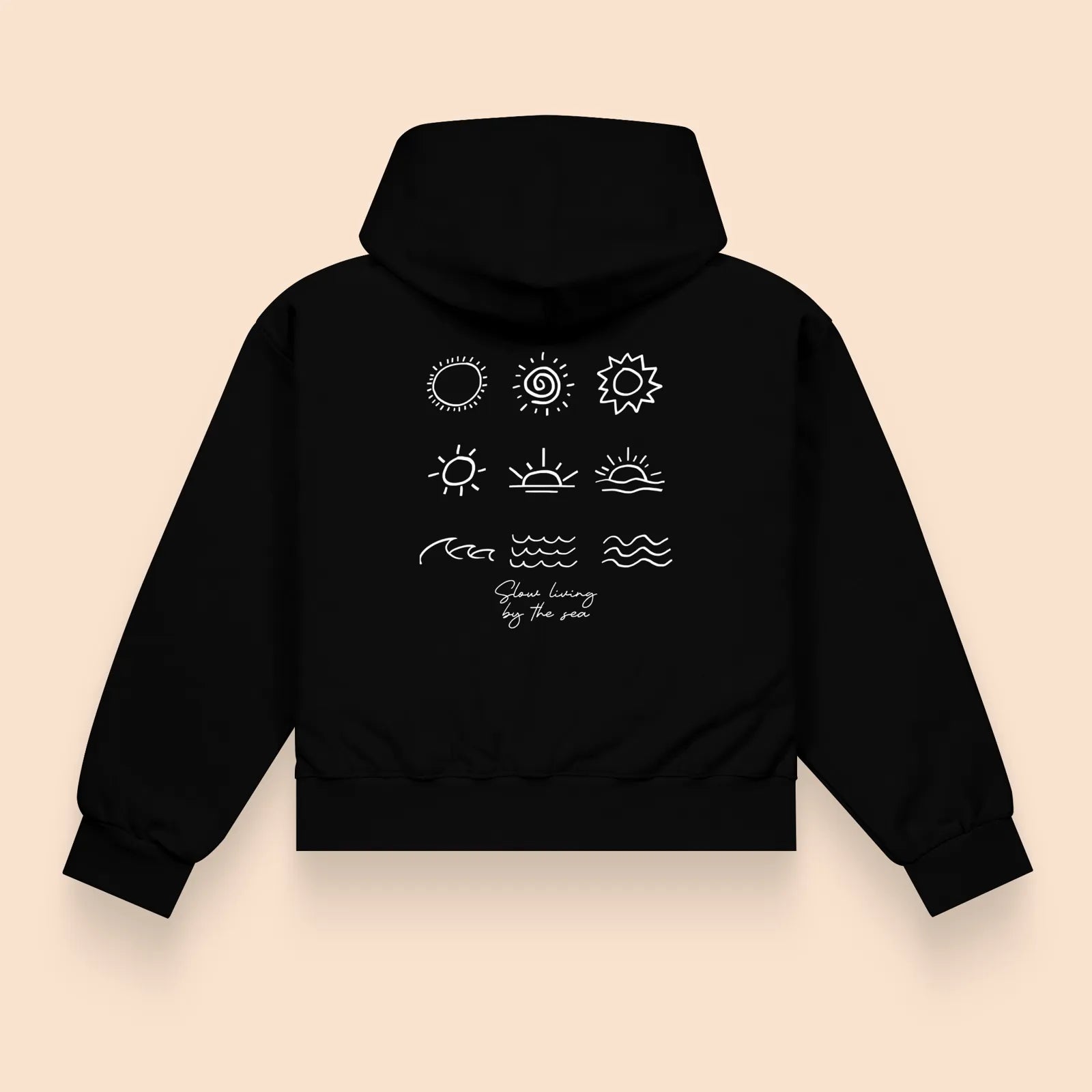 Un hommage aux symboles éternels de l’été : soleils éclatants, vagues infinies et horizons ouverts. Ce hoodie raconte la sérénité des journées passées au bord de l’océan, quand le temps semble suspendu. Avec son coton épais et sa coupe oversize, il enveloppe de chaleur tout en gardant l’esprit des beaux jours toujours vivant.