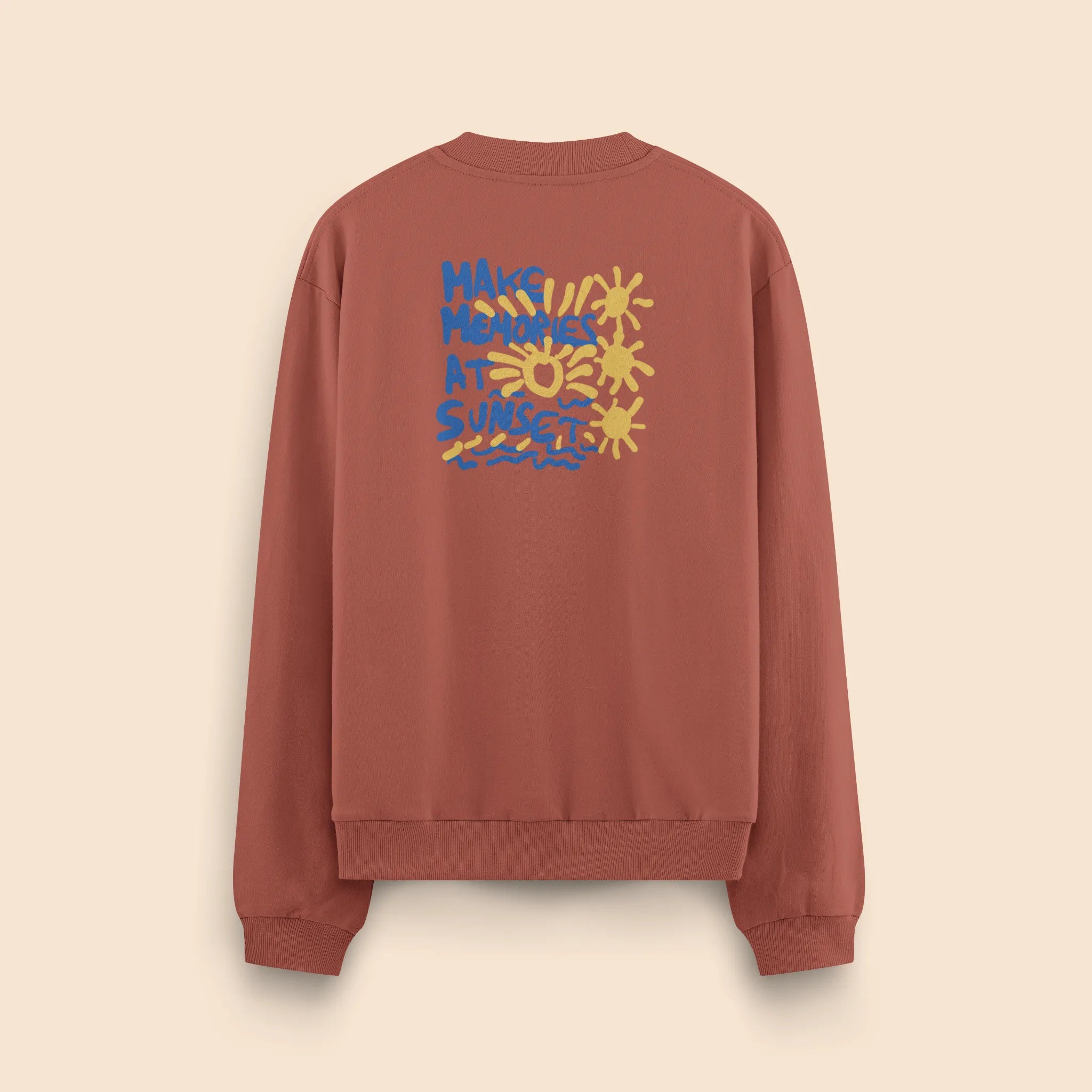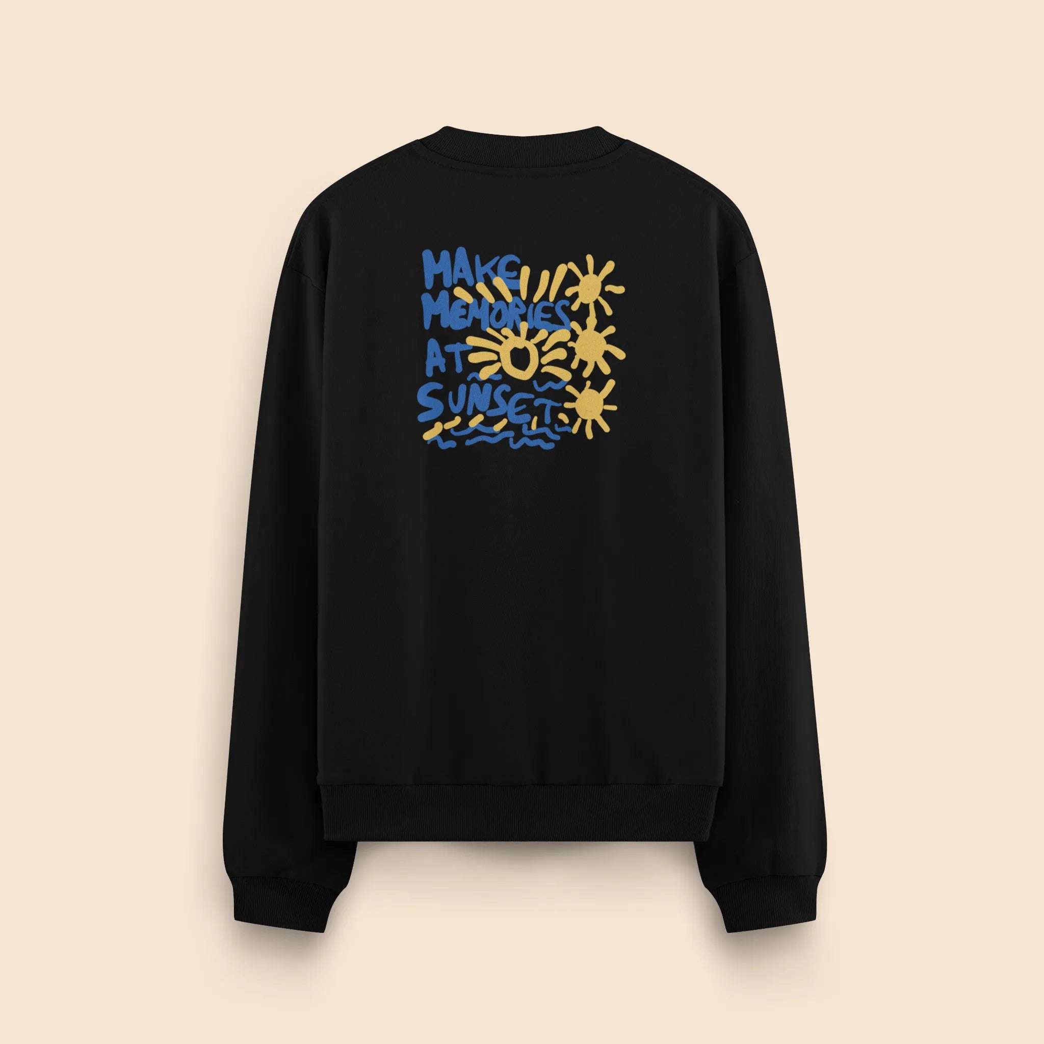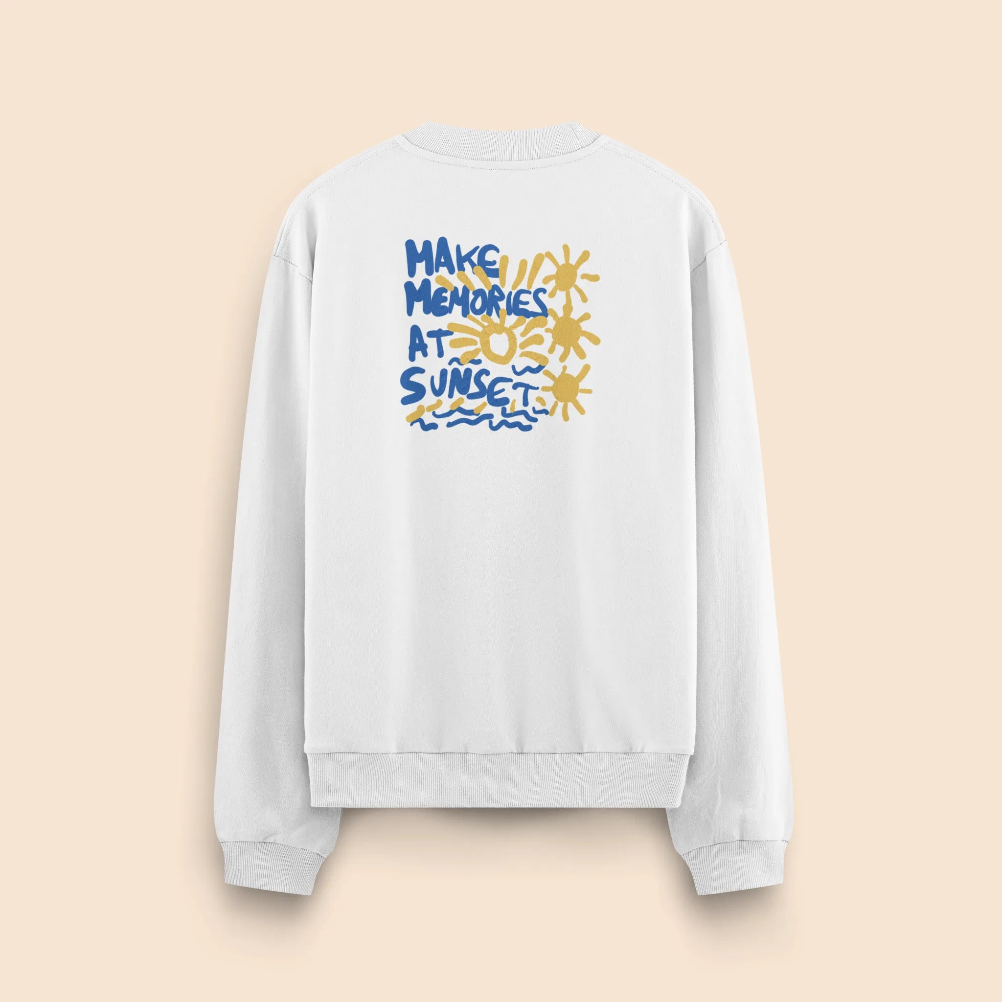 Capturez l’essence des plus beaux soirs d’été avec le hoodie "Make Memories at Sunset". Doux, oversize et réconfortant, il affiche un design coloré au dos avec une typographie en bleu océan et des soleils jaunes éclatants, invitant à profiter de chaque instant face à l’horizon.