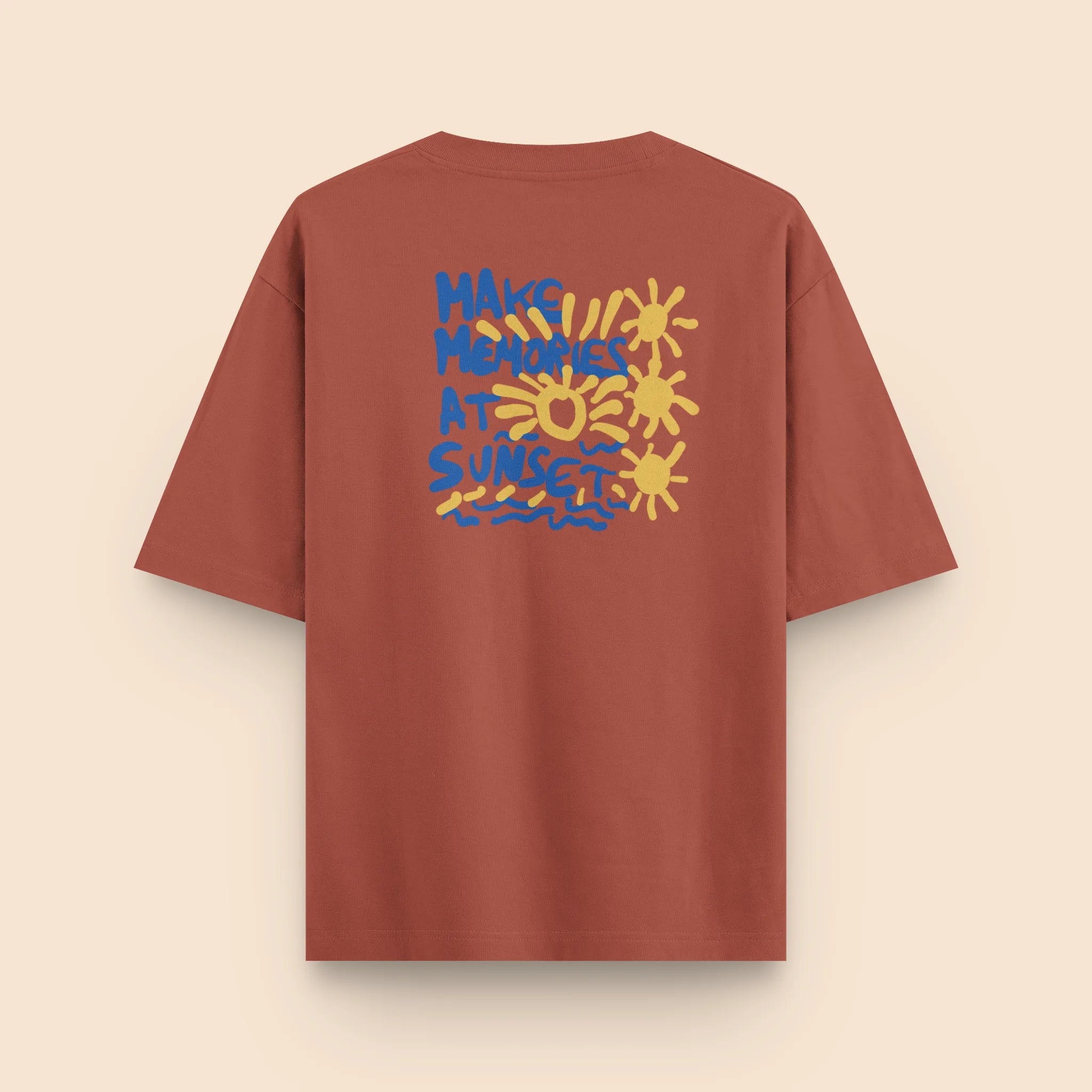 Un hommage aux couchers de soleil qui marquent nos plus beaux souvenirs. Ce t-shirt capture l’essence des instants précieux avec un design éclatant : un soleil jaune rayonnant sur des vagues bleues, accompagné de l’inscription "Make Memories at Sunset". Confortable et intemporel, sa coupe oversize et son coton épais en font une pièce parfaite pour ceux qui vivent au rythme du soleil et des aventures. À porter en toute saison pour garder l’esprit des beaux jours toujours avec soi.